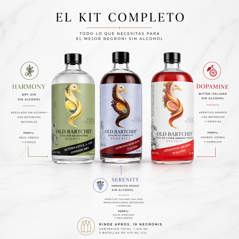 Con el Paquete Negroni 0.0% de Old bARTchef, recreas uno de los cócteles más icónicos del mundo con la misma complejidad, cuerpo y carácter… pero 100% libre de alcohol.